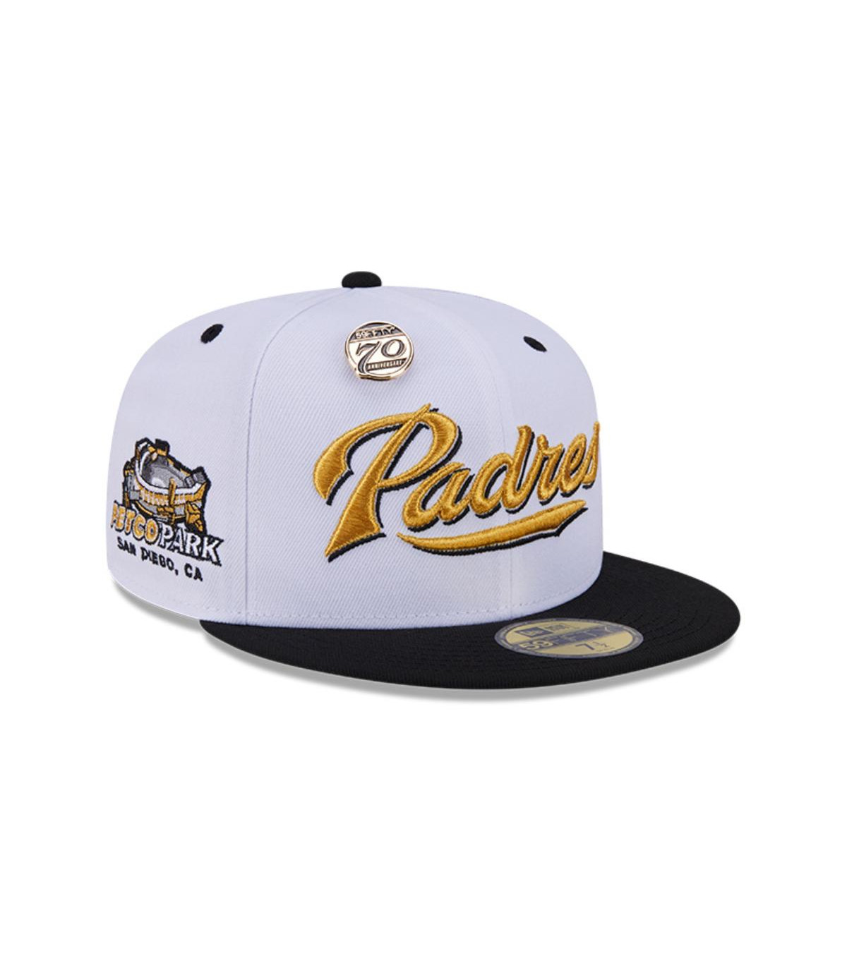 Celebra el 70 aniversario de la silueta que cambió el juego con esta gorra New Era 59FIFTY de San Diego Padres de la colección del New Era Cap 59FIFTY Day Collection que presenta una corona blanca con el nombre de los Padres en dorado bordado en los paneles frontales, el pin del 70 aniversario, un parche conmemorativo del lado derecho, el logo de la liga al reverso y el flag de New Era bordado en el lado izquierdo. No te pierdas este artículo de colección y cómprala ya.
